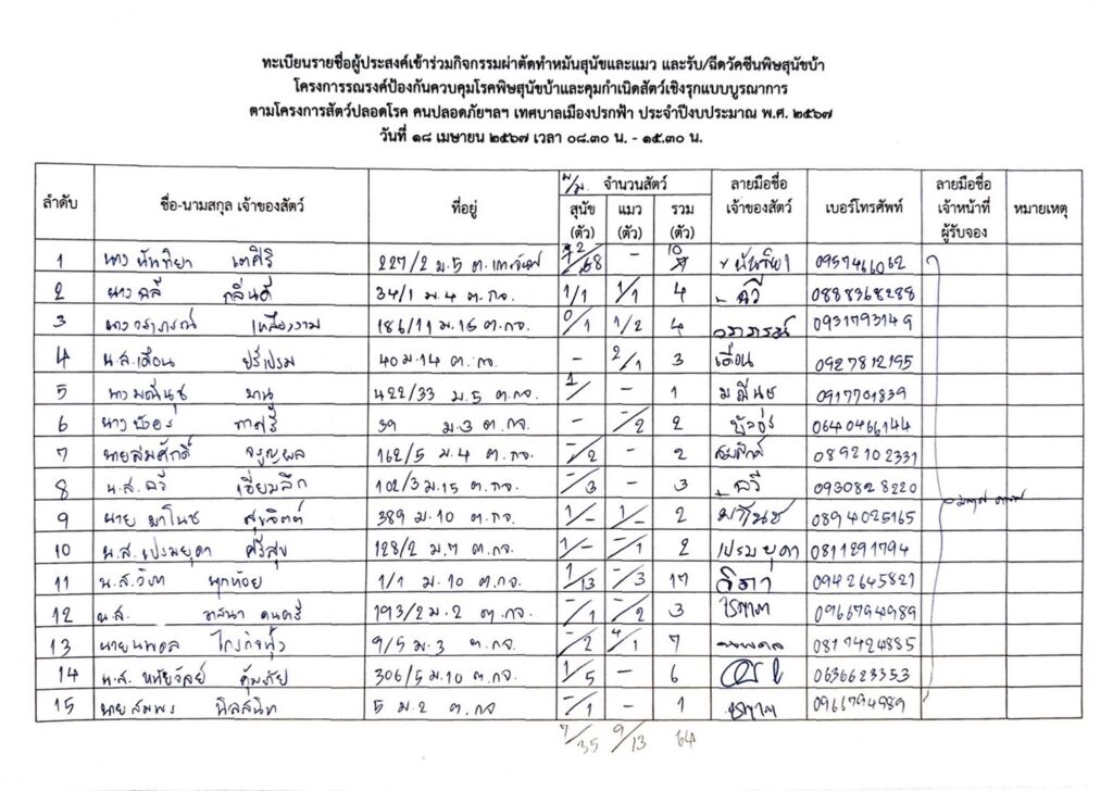 พรุ่งนี้แล้วนะคะ..อย่าลืมเตรียมตัวน้องหมา น้องแมวให้พร้อม เพื่อเข้ารับบริการการทำหมัน ในโครงการรณรงค์ป้องกัน ควบคุมโรคพิษสุนัขบ้า และคุมกำเนิดสัตว์เชิงรุกแบบบูรณาการ เทศบาลเมืองปรกฟ้า ประจำปีงบประมาณ พ.ศ.2567 ระหว่างวันที่ 18-19 เมษายน 2567 (สามารถตรวจสอบรายชื่อที่ด้านล่างได้เลยค่ะ)