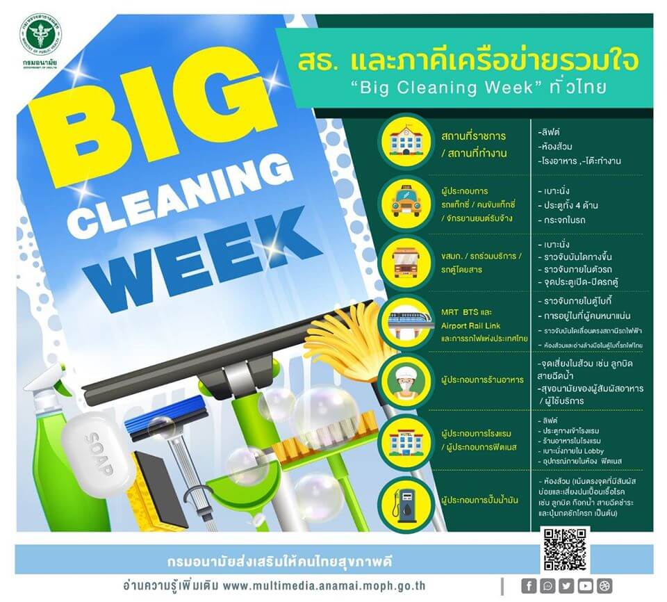 ขอเชิญร่วมกิจกรรม “Big Cleaning Week จิตอาสาสู้โคโรนาไวรัส” โดยการร่วมเป็นส่วนหนึ่งในการทำความสะอาดสถานประกอบการของท่านให้ถูกสุขอนามัย เพื่อป้องกันการแพร่กระจายของเชื้อไวรัส