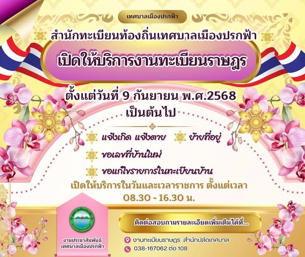 ขอเรียนเชิญพี่น้องประชาชนทุกท่าน..เข้าร่วมพิธีการเปิดให้บริการสำนักทะเบียนท้องถิ่นเทศบาลเมืองปรกฟ้า ในวันอังคารที่ 9 กันยายน พ.ศ. 2568