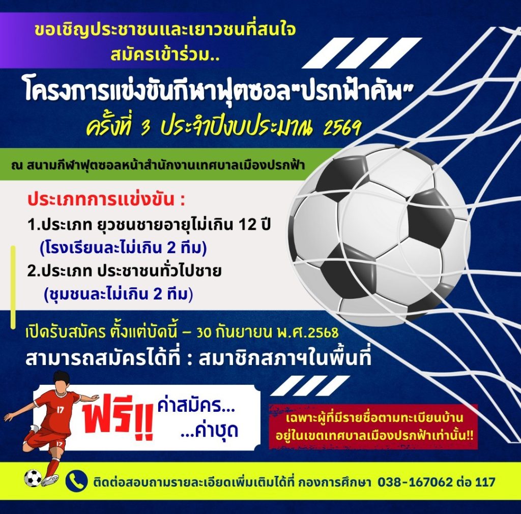 เทศบาลเมืองปรกฟ้าขอประชาสัมพันธ์เชิญชวนประชาชนและเยาวชนที่สนใจ สมัครเข้าร่วมการแข่งขันกีฬาฟุตซอล “ปรกฟ้าคัพ” ครั้งที่ 3 ประจำปีงบประมาณ 2569…ได้ตั้งแต่บัดนี้จนถึงวันที่ 30 กันยายน พ.ศ.2568