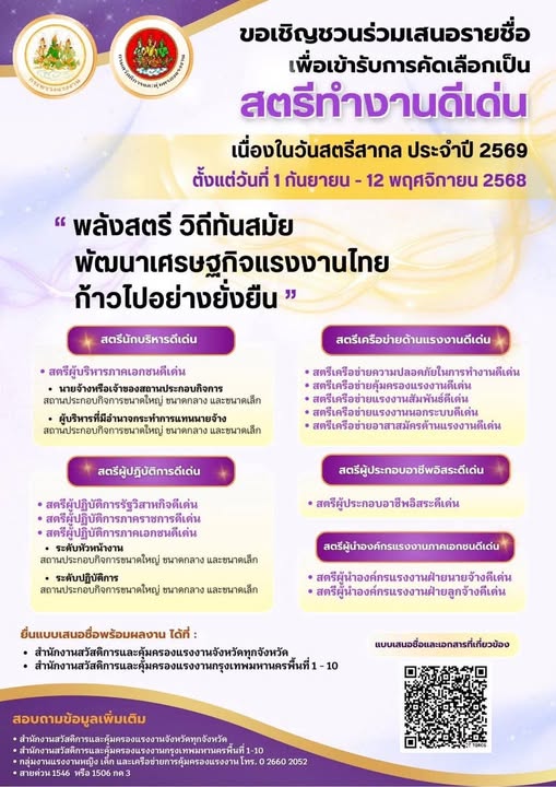 ขอเชิญชวนร่วมเสนอรายชื่อ ‘สตรีทำงานผู้มีผลงานโดดเด่น เป็นแรงบันดาลใจ และสร้างคุณประโยชน์แก่สังคม’ เพื่อเข้ารับการคัดเลือกเป็น สตรีทำงานดีเด่น ปี 2569