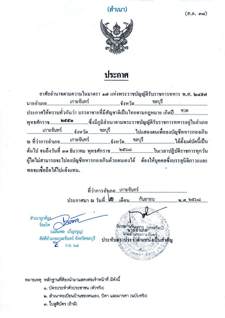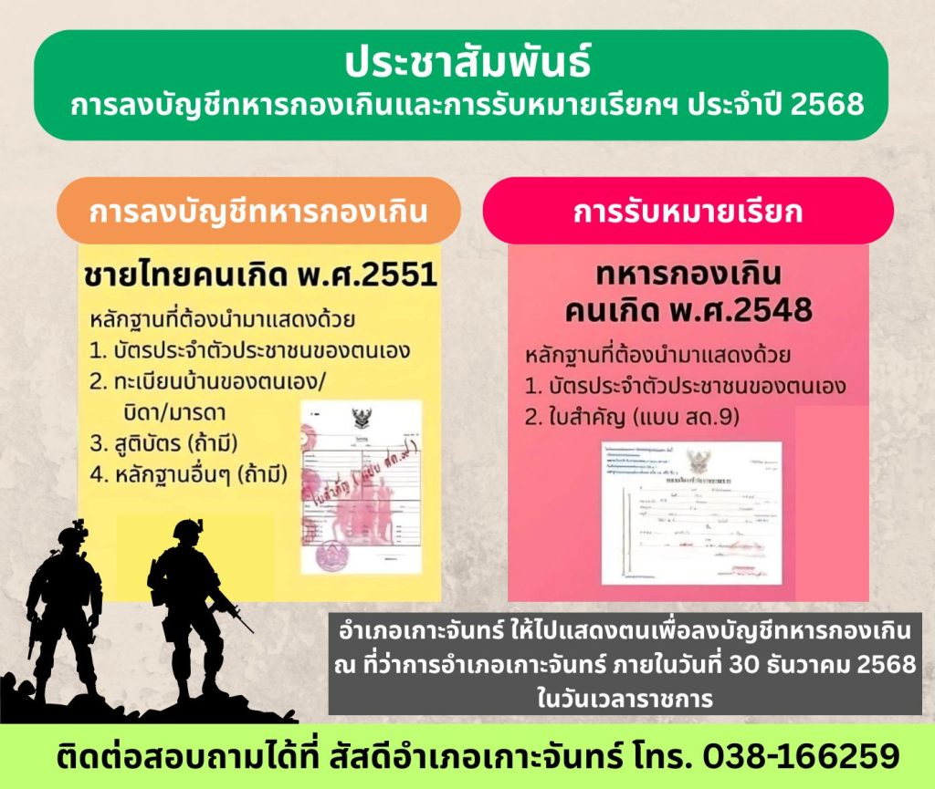 อำเภอเกาะจันทร์ ให้ไปแสดงตนเพื่อลงบัญชีทหารกองเกิน ณ ที่ว่าการอำเภอเกาะจันทร์ ภายในวันที่ 30 ธันวาคม 2568 ในวันและเวลาราชการ